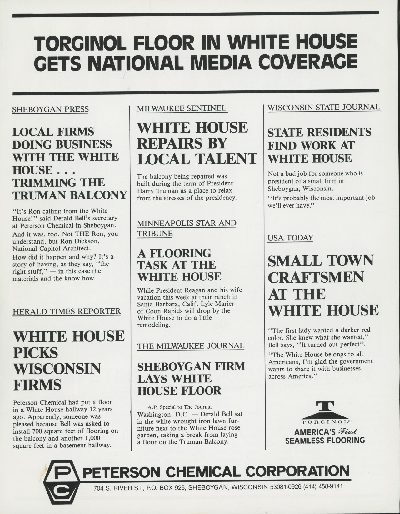 Darald Bell, an entrepreneur from Sheboygan, Wisconsin, purchases Peterson Chemical Corporation. The company operates as a family business for the next 30 years, manufacturing seamless flooring systems under the tradename TORGINOL® and manufacturing epoxy resin paints for military applications.